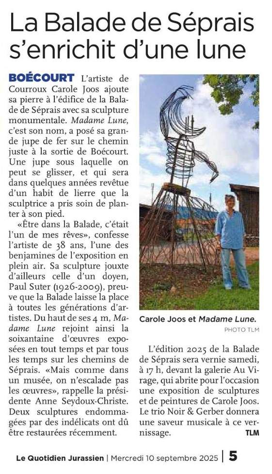 Pour la Balade de Séprais, Carole Joos propose, avec un langage qui la caractérise, à la croisée du surréalisme, de l’art brut et du symbolisme, une sculpture monumentale qu’elle décrit simplement de la sorte : « Sculpture en métal composée d’une jupe (sorte de treillis conique), dans laquelle les visiteurs peuvent se glisser. Afin d’être en accord avec son environnement, des plantes grimpantes longent et montent le long de la jupe. Le haut du corps est en métal et illustre un buste avec une tête en forme de lune, tenant dans une de ses mains des pendules et un mobile sonore. Toute la sculpture invite le visiteur à la fois à l’introspection, mais également à se tourner vers ce qui peut venir d’ailleurs… »