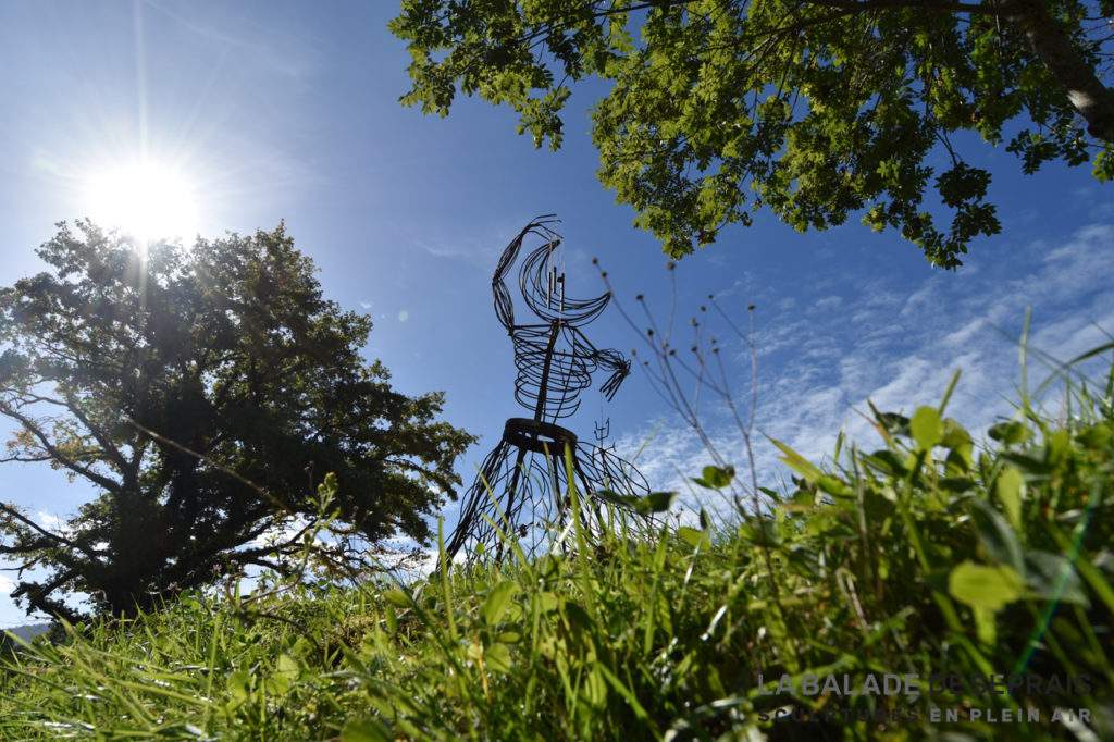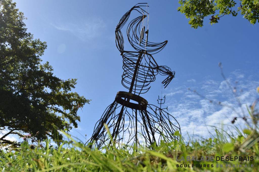 Carole Joos est une artiste suisse originaire de Breitenbach (SO), ayant grandi, vivant, travaillant et élevant sa fille dans le canton du Jura. Pour la Balade de Séprais, Carole Joos propose, avec un langage qui la caractérise, à la croisée du surréalisme, de l’art brut et du symbolisme, une sculpture monumentale, Madame Lune, une sculpture en métal composée d’une jupe, dans laquelle les visiteurs peuvent se glisser. Afin d’être en accord avec son environnement, des plantes grimpantes longeront et monteront bientôt le long de la jupe. Le haut du corps est en métal et illustre un buste avec une tête en forme de lune, tenant dans une de ses mains des pendules et un mobile sonore. Toute la sculpture invite le visiteur à la fois à l’introspection, mais également à se tourner vers ce qui peut venir d’ailleurs.