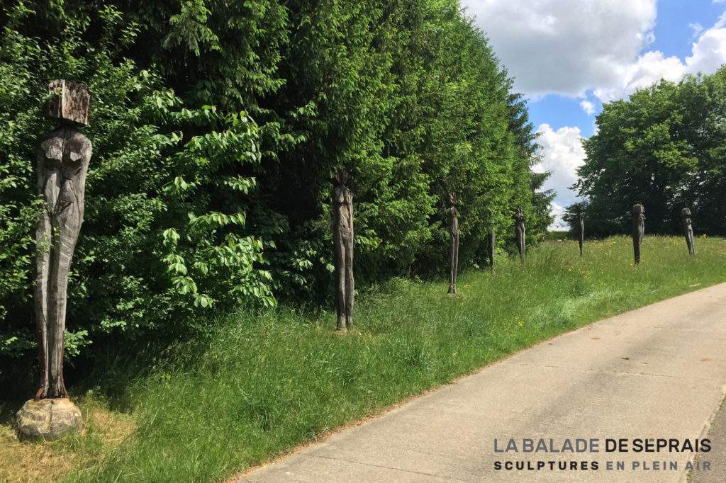 Par le traitement brut et allusif du bois, l’artiste évite une représentation trop réaliste pour mieux suggérer la seule présence humaine. Saisissant, ce groupe rend tout lieu nécessairement habité. Les intempéries ont malheureusement eu raison de lui. Les Neuf de Bâle ont quitté la Balade de Séprais…